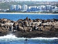 モッセルベイからボートで20分ほど行くと、小島を埋め尽くすオットセイの大群が見えてきた=3月29日、石原孝撮影