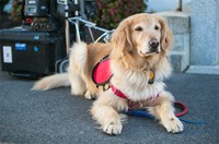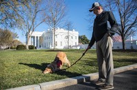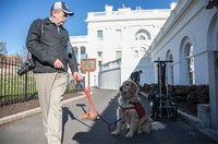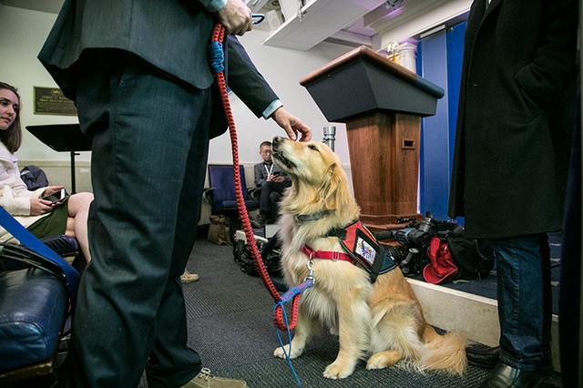 男性の名は、ジェームズ・ブレナンさん、56歳。5歳になるオスのゴールデンレトリーバーの名はストライカー。ジェームズさんは自ら立ち上げた退役軍人に向けたメディアのジャーナリストとして、ちょうど1年前からホワイトハウスに姿を見せるようになった。その愛らしさと行儀の良さから、ホワイトハウスの人気者となったストライカーは、「サービスドッグ」と書かれた赤いベストを着ている。その上には「身体障害のある退役軍人」という文字も。ただ、ジェームズさんは盲目でも、手足が不自由なわけでもない。