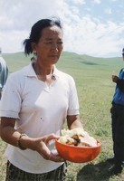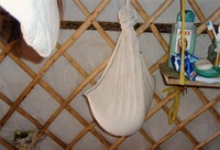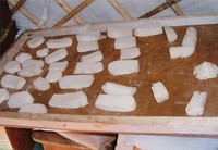 春夏には乳を使い、ヨーグルトやチーズ、バター、馬乳酒(アルコール分の低い乳酸菌健康飲料のようなもの)など、乳製品を作ります。それらが、「白い食事」と呼ばれる夏の食べ物。チーズも、固めてゲルの屋根などに干して水分を抜き、保存します。スープなどに入れるチーズには塩を、お菓子として食べるものには砂糖を少し入れます。こうして見てゆくと、実に捨てるところなく使い切って生きていることに、感動させらるのです。