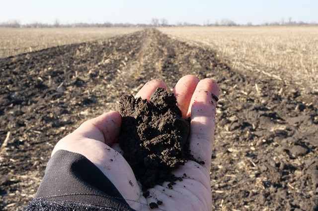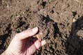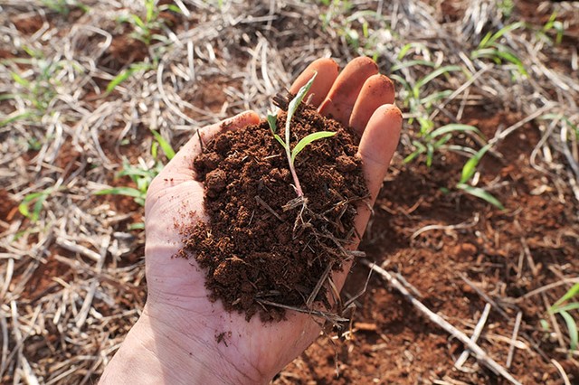 不耕起農業によって有機物が増えてきたブラジルの土。土の中に草の根や茎が残っているほか、腐植が増えてやや黒みを帯びている