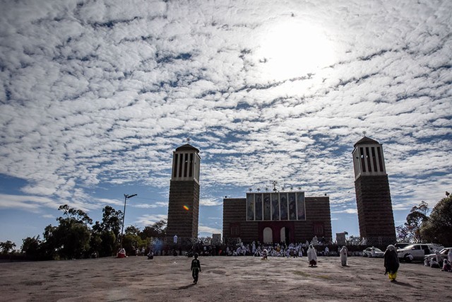 アスマラ中心部の大通りに面するのは、カトリックの大聖堂。高い建物がほとんどないアスマラで、時計塔は散歩をする際の目印にもなります。すぐ近くには、エリトリア正教の教会もあります。どちらも礼拝がある日曜日に訪れたので、大勢の信者が祈りを捧げていました。