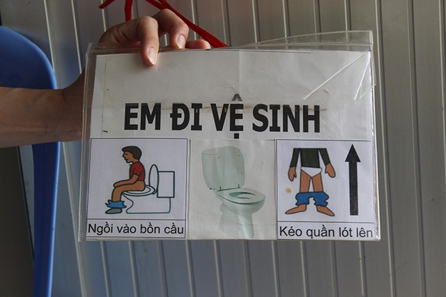 先生は「トイレに行きたい」「この色の椅子に座りたい」といった意味のイラストを使って、言葉での意思表示が難しい子どもたちとやりとりをする。笑顔でボール投げをしていた長男は、「タンビエット(さようなら)」「モッ、ハイ、バー(1、2、3)」といったベトナム語も覚えた。日本語が通じない環境で、彼は頑張っていた。