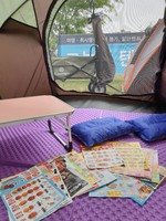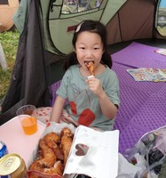 河辺に下りると、テントゾーン、出前ゾーン、ゴザなど敷物だけを使うゾーンなどに分かれていた。私たちはテントゾーンへ。レンタル店のスタッフの説明の通り、テントはまさにワンタッチ。キャンプをよく知らない私にもカンタンだ。中にマットを敷き、枕に頭をのせて横になると、もう世の中にこれ以上のものはない、という気分。娘は、キックボードで河辺の道を走っている。夫はおなかがすいたのか、出前のチラシをじっくり見ている。