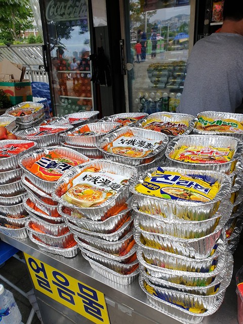 漢江だけで売っているラーメンがある。インスタントラーメンでも、カップではなく、袋に入ったラーメンをアルミホイルで作ったお皿に入れて売っている。「カップでも袋でも同じラーメンなのでは?」という声が聞こえてきそうだが、風変わりなお皿、野外、大切な人たちと食べるラーメンは、絶対においしい。コンビニでこのラーメンを買い、熱いお湯を入れて、準備完了。歩いてテントに戻れば、ラーメンはちょうどいい感じのはずだ。ラーメンとチメクのセットを手に、足取りも軽くなる。