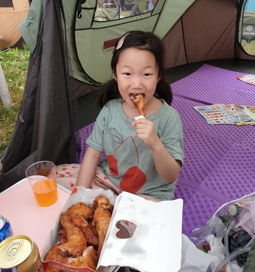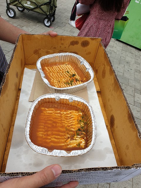 私たちは、受け取ったチラシのなかから、一番おいしそうに見えるお店に電話をした。チメクのセットで2万ウォン(約2千円)。お店のスタッフは「出前ゾーンまで受け取りに来てください」とい言う。ふだんなら、座っているところまで持ってきてくれるが、人も多いので混乱を避けるためだろうと思っていた。すると、隣のテントにオートバイがやって来たかと思うと、冷麺を出前して立ち去っていった。やっぱりね……。でも、出前ゾーンにあるコンビニでインスタントラーメンを買うから、まあ、いいか。