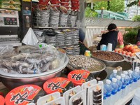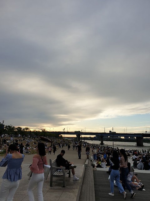 漢江の河辺におりる場所では、出前の食べ物のチラシを配るおばさんたち、屋台、コンビニに立ち寄ろうとする人たちで、ごったがえしていた。「後で何を食べようか」。私たちもチラシをいっぱいもらった。