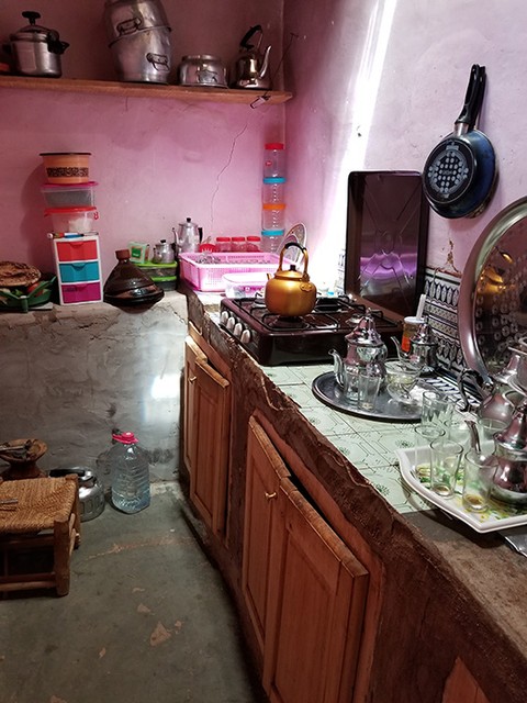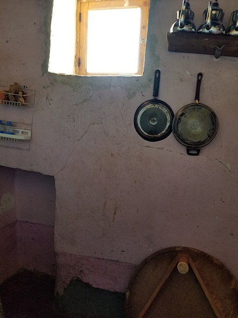 室内は、遊牧民とあって本当にモノがなく、すっきりとしていました。木枠や扉やドアといった建材が、部分的に岩と組み合わせてあって、それも特徴的。持ち物といえば、絨毯、かまど、編み物、少しの調理道具程度です。茶色い空間に、美しい模様のモロッコ絨毯や、工芸品が生えて、必要なものしかないのに素敵なのです。片付けの必要ないシンプルな暮らし。モノが少ないのは良いなと思いました。
