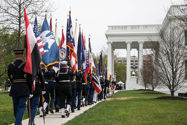 よく使われる歓迎地点はウエストウィングの玄関。首脳を乗せた車は普段報道関係者が出入りするホワイトハウスの北口から入り、旗を掲げる60人ほどの儀仗兵の列をくぐり抜け、大統領が待つウエストウィングの入り口に到着する。陸軍、海軍、空軍、海兵隊の兵士が軍旗や州旗を掲げながら歓迎する時もあれば、護衛以外の儀仗兵は全くいない時もある。