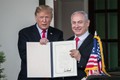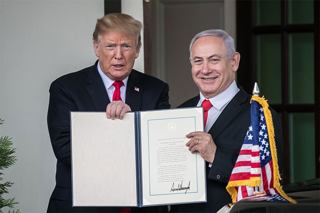 トランプ大統領がイスラエルのネタニヤフ首相を見送った際、ゴラン高原のイスラエル主権を認め署名した文書をカメラに向け披露した=ワシントン、ランハム裕子撮影、2019年3月25日