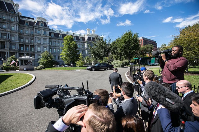 チリのピネラ大統領を乗せ、ホワイトハウスの敷地内をウエストウィングに向かいゆっくり走る車。手前では到着の様子を取材するホワイトハウス記者団が待ち構える=ワシントン、ランハム裕子撮影、2018年9月28日