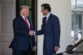 ホワイトハウスでカタール首長を迎えるトランプ大統領。握手する手は、やはり自分の体の方へ引っ張っている=ワシントン、ランハム裕子撮影、2019年7月9日