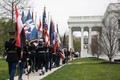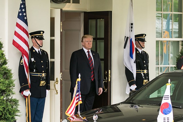 ホワイトハウスに到着する韓国の文大統領を乗せた車。玄関には右に韓国の旗、左に米国旗を持った儀仗兵が立つ。トランプ大統領は車到着の1分ほど前に姿を現す=ワシントン、ランハム裕子、2018年5月22日