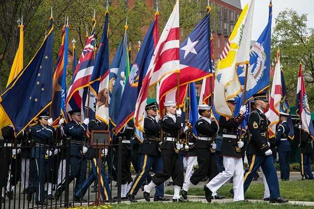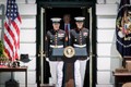 ホワイトハウスの敷地内で、エジプトのシシ大統領の到着に備え行進する儀仗兵たち。掛け声に合わせ、足並みは常に揃っている=ワシントン、ランハム裕子