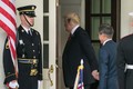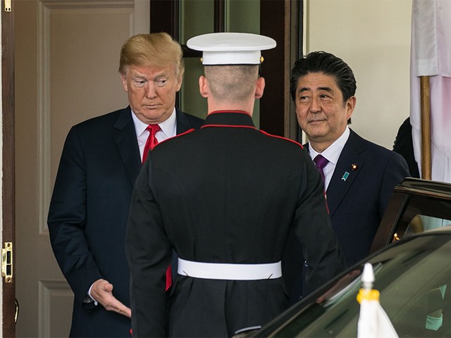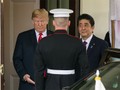 安倍晋三首相にとって、トランプ政権発足以来2度目のホワイトハウスへの訪問。トランプ大統領がウエストウィング玄関で安倍首相を迎えた時の、この表情は何だったのか=ワシントン、ランハム裕子撮影、2018年6月7日