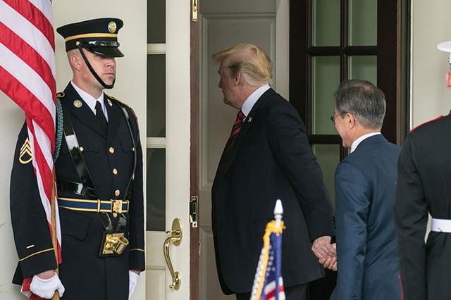 トランプ大統領に手を引かれ、ホワイトハウス内へ入る文大統領。二人の手が見えるが、繋ぎ方がどうも不自然=ワシントン、ランハム裕子、2018年5月22日
