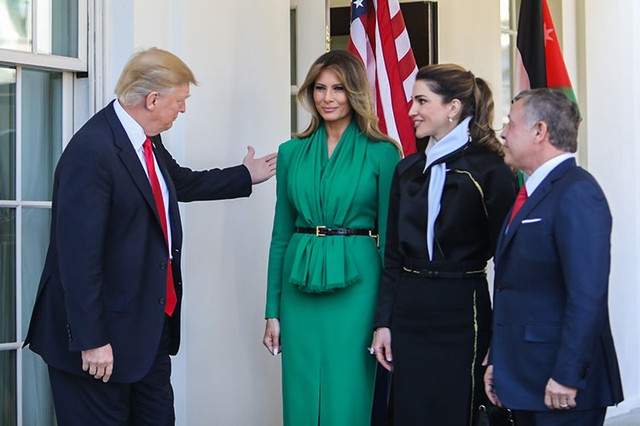 ウエストウィング入り口で記者団に向かいポーズの準備をする(左から)トランプ大統領、メラニア夫人、ヨルダンのラニア王妃とアブドラ国王。トランプ大統領が立ち位置などを立ち位置などを指示しているように見える=ワシントン、ランハム裕子撮影、2017年4月6日