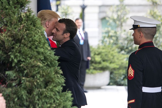 国賓としてホワイトハウスに招待されたフランスのマクロン大統領。植木が明らかにフォトグラファーの視界を遮っている。。。=ワシントン、ランハム裕子撮影、2018年4月23日