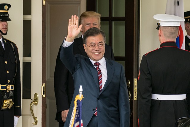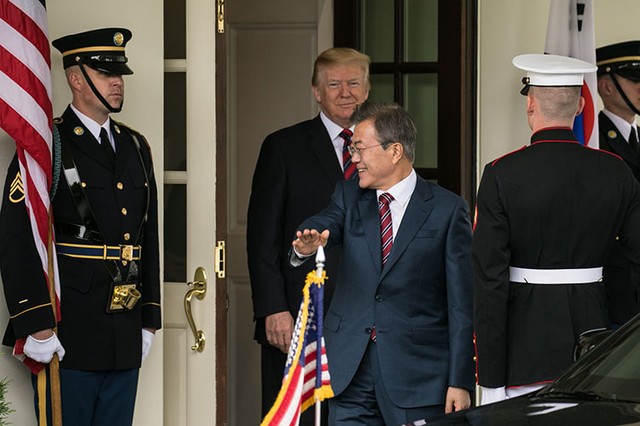トランプ政権発足後初の文大統領によるホワイトハウス訪問。大統領夫妻は、赤絨毯が敷かれた玄関でトランプ大統領とメラニア夫人に迎えられた=ワシントン、ランハム裕子撮影、2017年6月28日