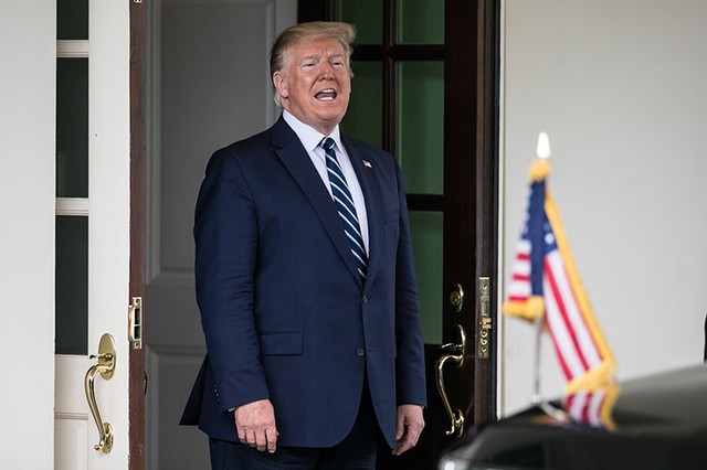カタール首長の到着を待つトランプ大統領。到着の約1分前に姿を見せ、険しい表情で無言で待つことが多い。ただ、カメラの位置を確認するかのように毎回記者団に睨みをきかせる=ワシントン、ランハム裕子撮影、2019年7月9日