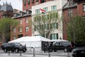 ブレアハウス。この日はエジプトのシシ大統領が宿泊していたため、エジプトの国旗が見える。シシ大統領は写真左の車で目の前にあるホワイトハウスへ向かう=ワシントン、ランハム裕子撮影、2019年4月9日