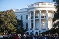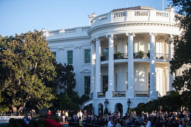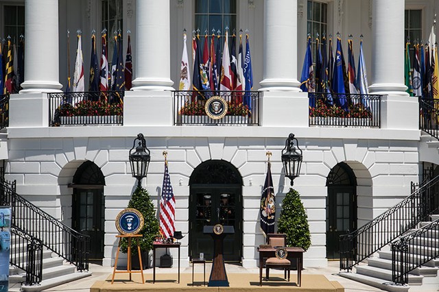 ホワイトハウス南側に位置するサウスポーティコで演説するトランプ大統領。バルコニーに繋がった部分は大統領家族の居住スペースとなっている=ワシントン、ランハム裕子撮影、2015年9月23日