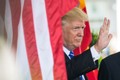 式典で演説するため、サウスポーティコの玄関から登場するトランプ大統領=ワシントン、ランハム裕子撮影、2019年7月15日