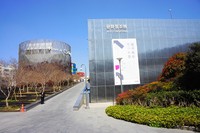 奥へ進むと、銀色のオブジェのある噴水や白いピースサインの像が現れた。地上は憩いの場、地下は現代アートの展示やワークショップの場と、ルーブル美術館さながらの造りだ。
