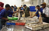 日本向けにタコを輸出しているモーリタニアのヌアディブでは、タコ漁を手がける多くの漁師が同社製の船外機を使用。漁が終わって港に戻ると、盗まれないように船外機を外し、大事そうに担いで倉庫などに保管していた。