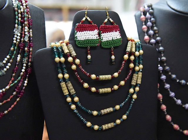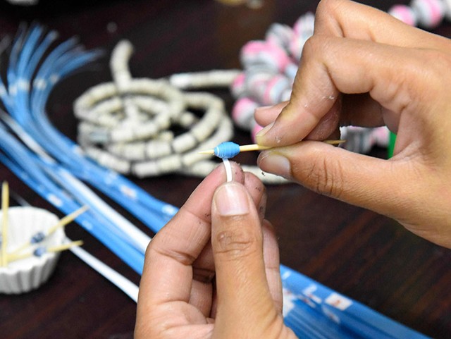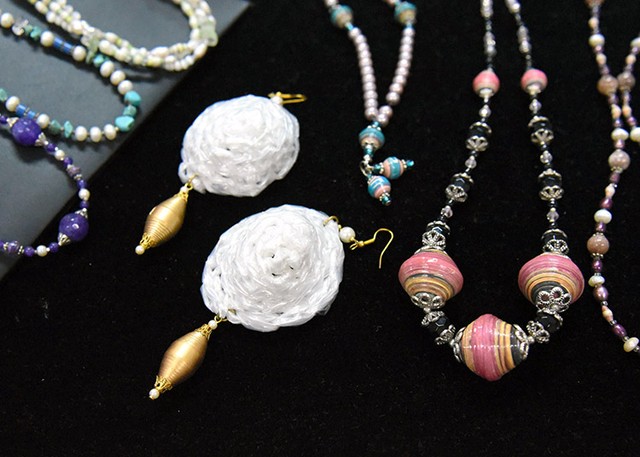 知り合いの企業に頼むなどして古いカレンダーや新聞紙を集めた。数ミリの幅に切り、その1本1本をつまようじに巻き付けると、小さな紙製のビーズが出来た。ビーズを糸に通すと、カラフルなネックレスやブレスレットになった。大ぶりな宝飾品が好まれるパキスタンには、ちょうどいいデザインだった。