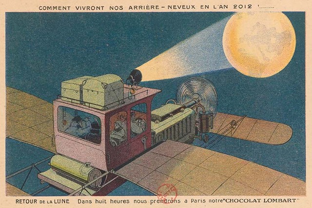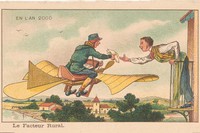 一連のシリーズには、老舗のチョコレート「ショコラ・ロンバール」のおまけとして同封されていたとみられる作品群もある。今回は、フランス国立図書館(BnF)が所蔵しているこれらの作品のうち画像データとして提供を受けた一部を紹介する。(En l’an 2000/[illustrations de Jean Marc Côté];Lithographie Villemard et fils,1910, BnF, département des Estampes et de la photographie.)