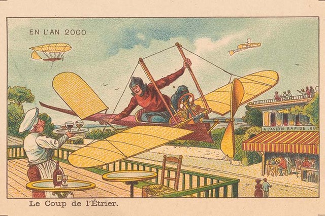 仕事や買い物にでかける人たちの「マイ飛行機」が空を飛び交い、交通巡査が違反切符を渡して取り締まっている。違反者を見つけて、ここぞとばかりに飛びついていく様子が妙にリアルだ。こんなに空が過密では、当然事故も起きるだろう。空飛ぶ郵便配達や、飛行機乗りが立ち寄るドライブスルーなど、一連のシリーズで目立つのが空飛ぶ人々の日常を描いた作品だ。当時は航空機が大量のCO₂を排出して環境問題をひき起こすことは予測されていなかった。果たして100年後のいま、プライベートジェットを日常的に利用するセレブリティーはいるにはいるが、地球温暖化が大きな問題になるなかで、冷ややかな目で見られがちだ。