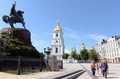 11世紀に創建されたソフィア大聖堂(奥)と17世紀に当時の支配者ポーランドに反旗を翻したコサックの英雄フメリニツキー像。彼の死後、ウクライナはロシアとポーランドに分割された