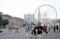 若者や家族連れが行き交うドニプロ川沿いのポジル地区の歩行者天国。レトロな街並みに新しい観覧車ができていた