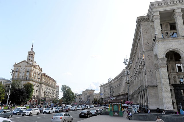 第2次大戦のナチス・ドイツ占領下で破壊され、戦後ソ連当局によって建て直されたフレシチャティク通りの建物群。道幅も大きく広げられた