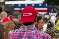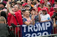 とはいえ、目の前で繰り広げられる光景はトランプ集会そのものだった。演説の合間に歓声や「U S Aコール」が飛び交う。会場には「M A G Aハット」(「米国を再び偉大に」のスローガンの頭文字を綴った帽子)をかぶった人や、再選に向け「トランプ2020」と書かれた弾幕を掲げる人が目立った。
