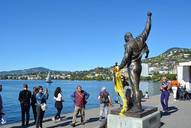 スイス・モントルーのレマン湖畔に立つフレディ・マーキュリーの銅像