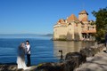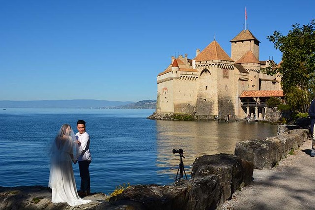 英国の詩人バイロンの詩にも出てくるシヨン城。レマン湖に浮かんでいるようにも見え、近くでアジア系のカップルが写真を撮影していた