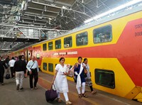 ゴトン。赤い2階建て列車が音をたてて動き始めた。14時20分、定刻だ。ゴトン。何度か動いては止まってを繰り返したあとは、すべるように走る。濃い緑の街路樹を抜けて崩れそうなビルの残骸やスラムを眺めながらムンバイの都市部を離れた。がっしりとした広軌のせいか、揺れない。トイレも清潔だ。シャツやカバン、文房具、モバイルグッズ、お菓子や弁当を売りに次々にやってくる。80ルピー(約130円)でスパイシーな炊き込みごはんビリヤニを買ってみた。まあまあだ。