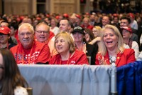会場に到着すると、そこはまさに「トランプ天国」。お馴染みのMAGA (“Make America Great Again”=アメリカを再び偉大に)や再選を支持する「トランプ2020」のスローガンが目に飛び込んでくる。多くの人が赤いMAGA帽子や星条旗を身にまとっている。