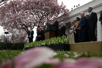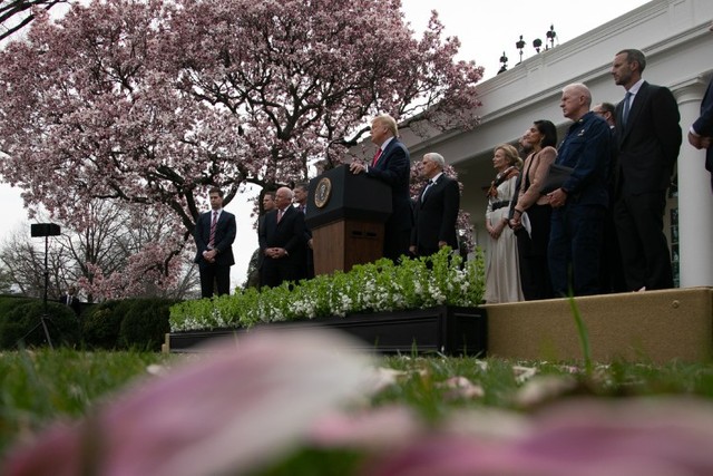 その後米国では、新型コロナウィルスの感染者や死者数が増加し、この日から約2週間後の3月13日、トランプ大統領は国家非常事態を宣言。大勢の人が一つの部屋に集合するこのようなイベントが次に開かれるのは、一体いつになることか……。通常であれば、たくさんの観光客で賑わう桜の季節。ゴーストタウンと化したワシントンでは、華麗な桜が寂しそうに咲いている。