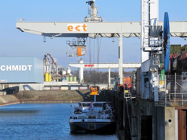 ライン川を行き交う船に積まれる貨物=ドイツ・デュイスブルク、村山祐介撮影