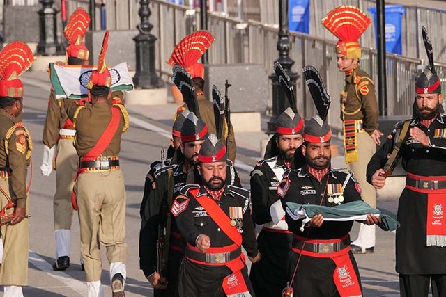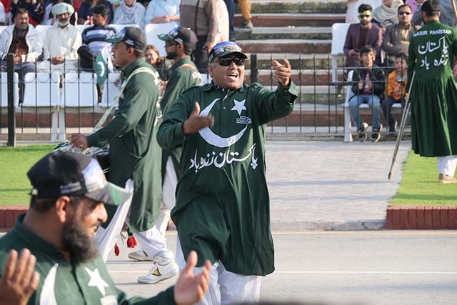 翌日も無人のインド側を前に、パキスタン側の熱気は高かった。会社員のムハマド・イルファン(39)は「子どもに、国を誇りに思う感情や、兵士たちが守ってくれる安心感を味わってもらいたかった」。娘のハディア(10)は「こんなにすごいとは思わなかった」と笑顔をはじけさせた。