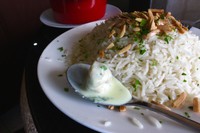 そんな文化的な違いを反映するかのように、ナブルスの「餃子」も異国を感じさせる味わいだった。羊のひき肉がワンタンのような皮に包まれ、ヨーグルトを使ったスープに浮かんでいた。これにバターで炊き込んだライスとともにいただく。通常のヨーグルトに加えて、乾燥させたヨーグルトを加えることでスープに独特の香味とコクを出しているという。なかなかに濃厚な味わいだ。餃子が中東に伝播すると、こうも違った料理になるのかと感慨深い。