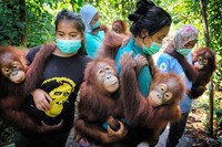 アブラヤシのプランテーションなどによる深刻な森林破壊に加え、温暖化による干ばつと高温で、毎年のように森林火災が発生。生息地は、これまでに80%以上の面積が失われたという。生息地の回復や個体の保護などの努力が続くが、絶滅の危険性からは脱せられていない。(山本大輔)