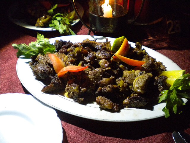 釣り上げられたナイルスッポンは15キロほどの大きさ。さらに、巨大なものがいると聞いた。足のもも肉を1本売ってもらい、レストランで調理してもらった。4人分は優にある大盛りの唐揚げになって運ばれてきた。鶏肉と牛肉を足して2で割ったような濃厚な味わい。栄養価が高そうで、赤ワインとの相性は抜群だった。