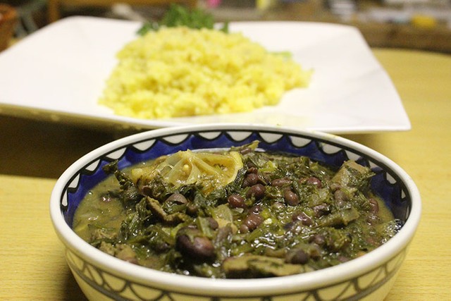 そんな一品がイランの国民食とも言えるゴルメサブジ。香草と果物を使った料理で、イラン国民に愛されている。ゴルメは煮込み、サブジは野菜を意味する。料理の見た目は地味だが、なかなかに滋味のある味わい。唐辛子などの辛味もなく、苦味と酸味、そして肉の旨みが絶妙な調和を見せている。