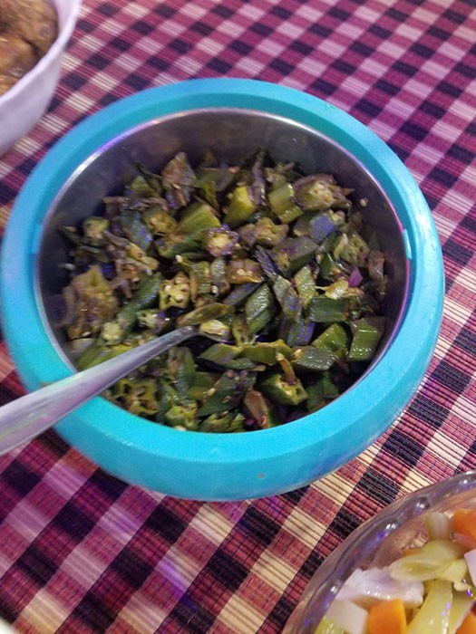 カニは多めの油ににんにくしょうが、玉ねぎ、カレーリーフとマスタードシード、クミンターメリックを入れて、塩をふったカニを加えて炒め、ココナツを加えました。えびは煮込んでカリーに。多めの油にマスタードシード、黒胡椒と言ったホールスパイス、にんにく、しょうが、玉ねぎ、トマトなどを入れてカレーベースのようなものに、エビを加えて煮込んでいました。南はとにかく魚介たっぷりです。これにご飯。