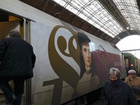 セルビア行きの列車は端っこのホームで待っていた。3両編成の落書き列車だ。イボ・アンドリッチ号。旧ユーゴスラビアのノーベル文学賞受賞作家の名前を冠している。350キロを約8時間かけて走る。一等車の運賃は片道28ユーロ(約3500円)。長距離バスと値段は変わらないが、2時間以上長くかかる。線路や通信施設が古いので速度を上げられないからだという。