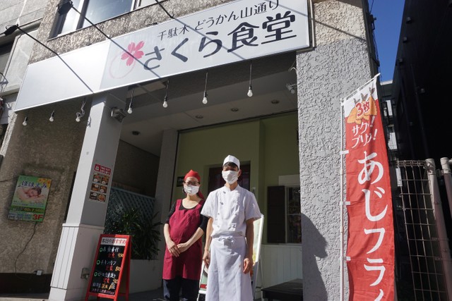 「千駄木どうかん山通り さくら食堂」は、JR西日暮里駅から徒歩7分ほどの、道路沿いにある小さな食堂だ。お店の入り口には「さくっ!プリッ!あじフライ」とのぼりが上がる。ドアを開けて入ると、「いらっしゃいませ!」と元気な声が響いた。自慢は生パン粉にこだわったミックスフライ定食(1080円)。ほかにもチキンカツ定食、赤魚の煮付け定食、刺し身定食など、おいしそうなメニューが壁にずらりと並んでいる。オムライスやポテトサラダ、サバの塩焼きなど単品もある。お昼どきとあって、次々とお客さんが入ってきた。男女のカップル、女性の2人組、一人でふらりと入ってくる高齢男性や若者も。どんな人も気軽に食事ができる、これぞ定食屋、という雰囲気だ。
