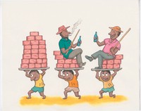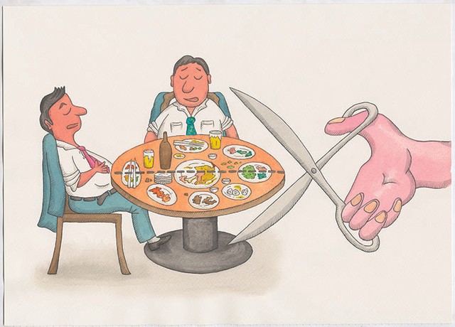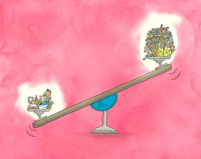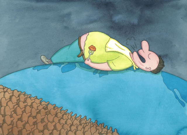 「貧困をなくそう」をテーマにした「今夜のごちそう」には、ニワトリをくわえたネコを羨ましそうに見つめる空腹の人間たちが描かれている。